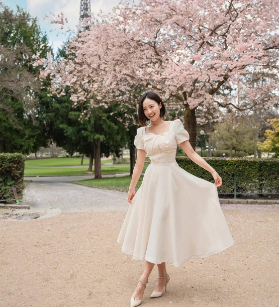 아이보리빛 플레어 원피스는 그녀의 청초한 분위기를 극대화했다. 가슴 아래에서 자연스럽게 퍼지는 실루엣은 로맨틱하면서도 클래식한 무드를 자아냈고, 봉긋하게 부풀린 퍼프 소매는 봄 햇살을 머금은 듯 따스한 인상을 남겼다. 여기에 발끝까지 이어지는 미디 길이는 단정하면서도 여성스러움을 살려냈다.
