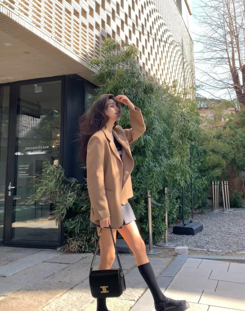 브라운 재킷, 니삭스, 미니스커트, 블랙로퍼 까지 완벽한 조합