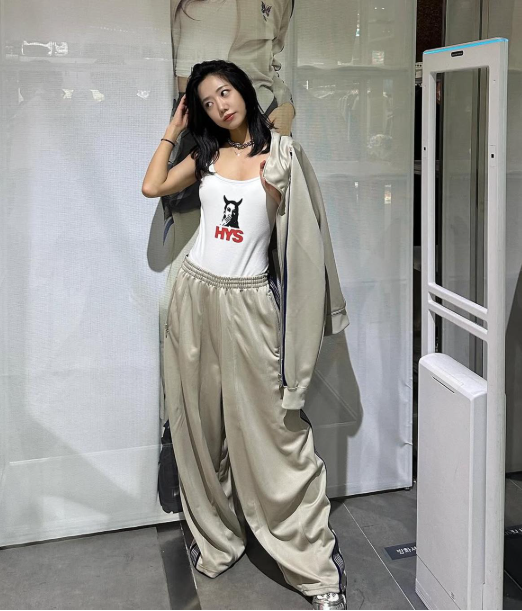 오버핏 실루엣의 트랙팬츠를 중심으로 스트리트 감성이 넘치는 룩을 선보였다. 은은한 베이지 톤의 와이드한 팬츠는 몸에 착 감기듯 자연스럽게 떨어지며 그녀의 감각적인 분위기를 더욱 부각시켰다.