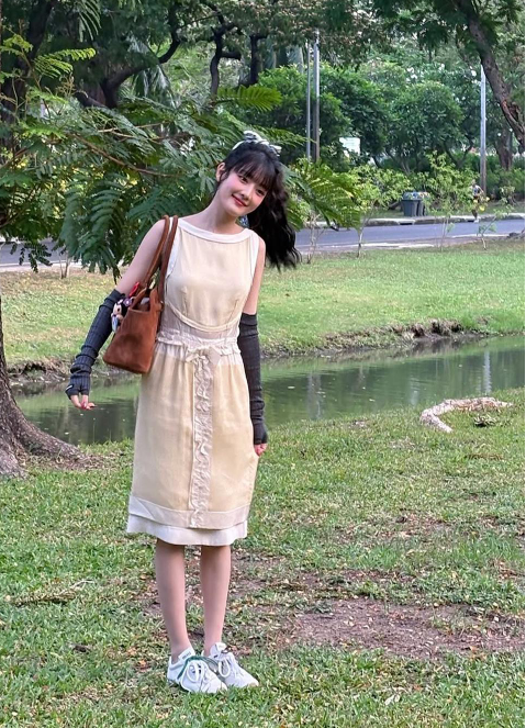 발끝에는 빈티지한 느낌의 운동화를 신어 클래식한 드레스 룩에 캐주얼한 터치를 더했다. 좌우 다른 컬러의 끈을 묶은 센스가 돋보이며, 평범할 수 있는 아이템을 통해 자신만의 스타일을 완성한 점이 인상 깊다. 운동화 특유의 자유로움과 드레스의 우아함이 민니를 통해 자연스럽게 연결된다.